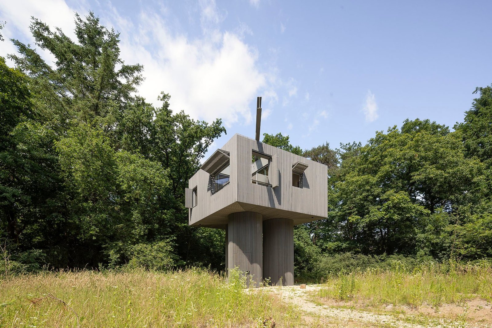 In een bosrijke omgeving is een bijzondere recreatiewoning gerealiseerd ontworpen door Space Encounters. Dit prachtige ontwerp doet denken aan een moderne boomhut. De woning is opgetild op ronde zuilen en is volledig omgeven door natuur. Dankzij de unieke vormgeving en materiaalkeuze vormt het gebouw een opvallend, maar harmonieus element in het landschap.