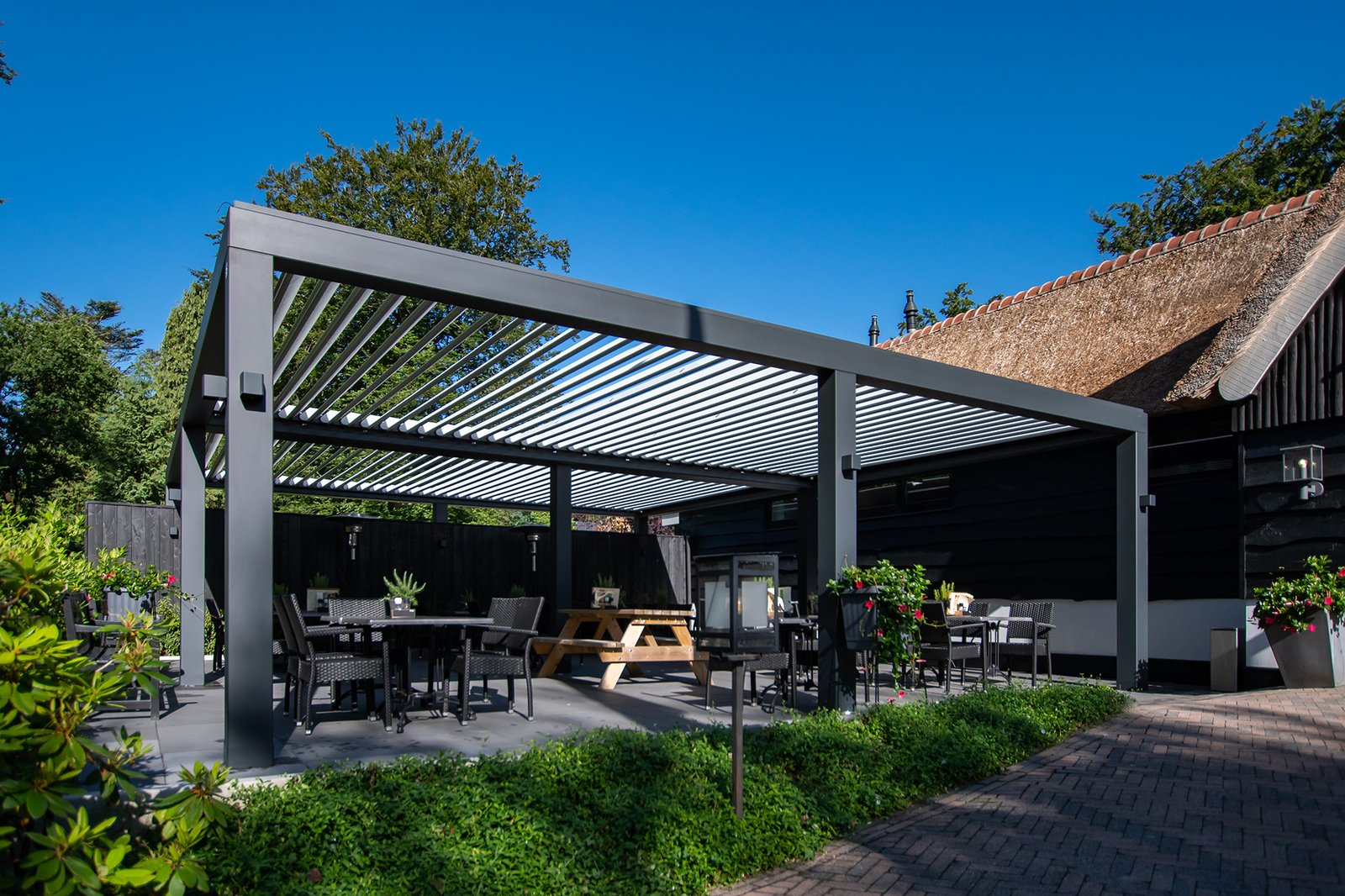 Lamellenoverkapping: de lamellen zijn kantelbaar en geven je de flexibiliteit om schaduw of zon te creëren. Omdat deze overkapping niet als permanent bouwwerk wordt gezien, is een vergunning meestal niet nodig.
