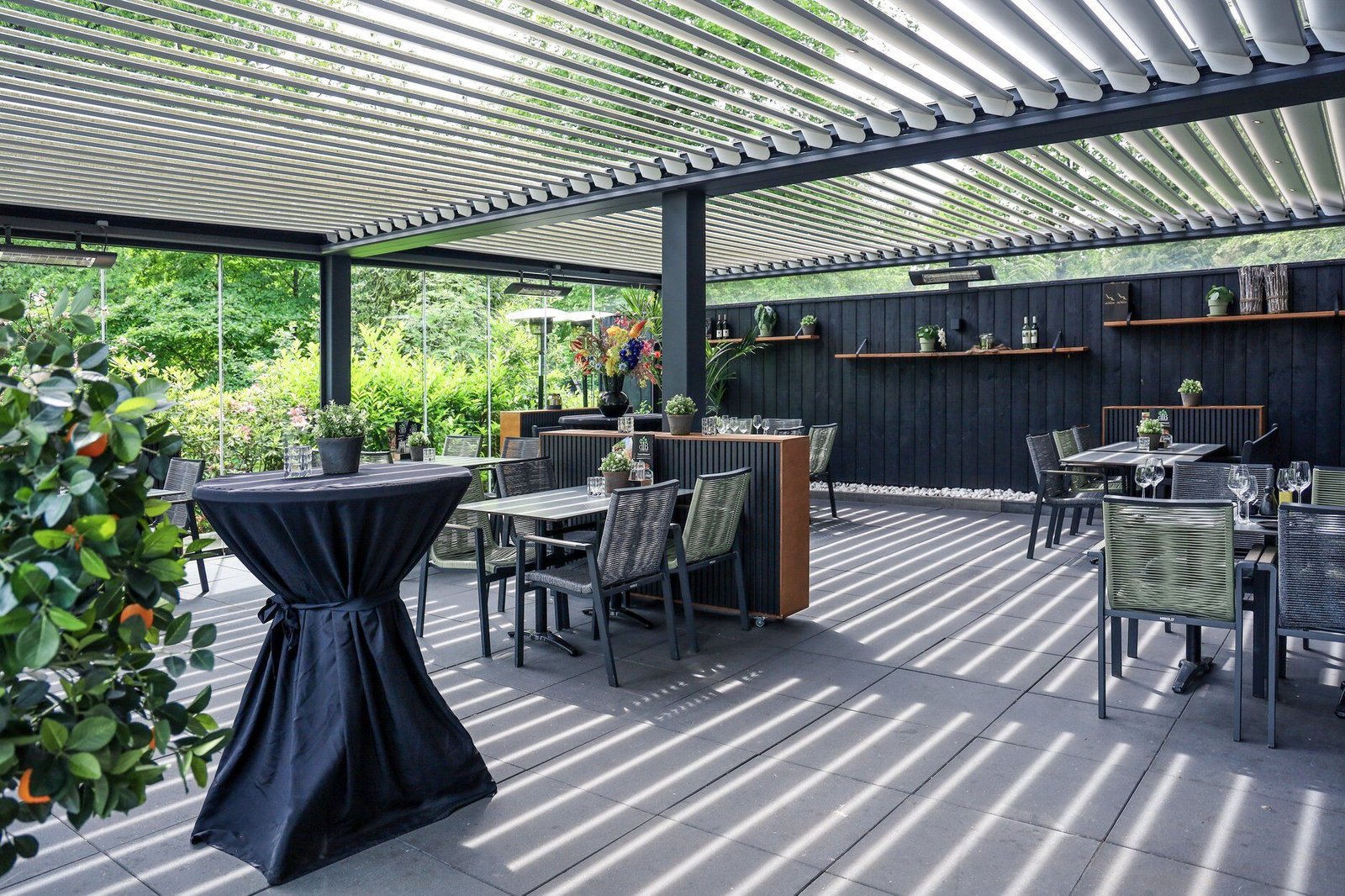 De terrasoverkapping met kantelbare lamellen is op maat gemaakt, zodat de overkapping naadloos aansluit op de rest van het pand. De grootte van de overkapping zorgt voor maximale zitruimte en comfort voor de gasten.