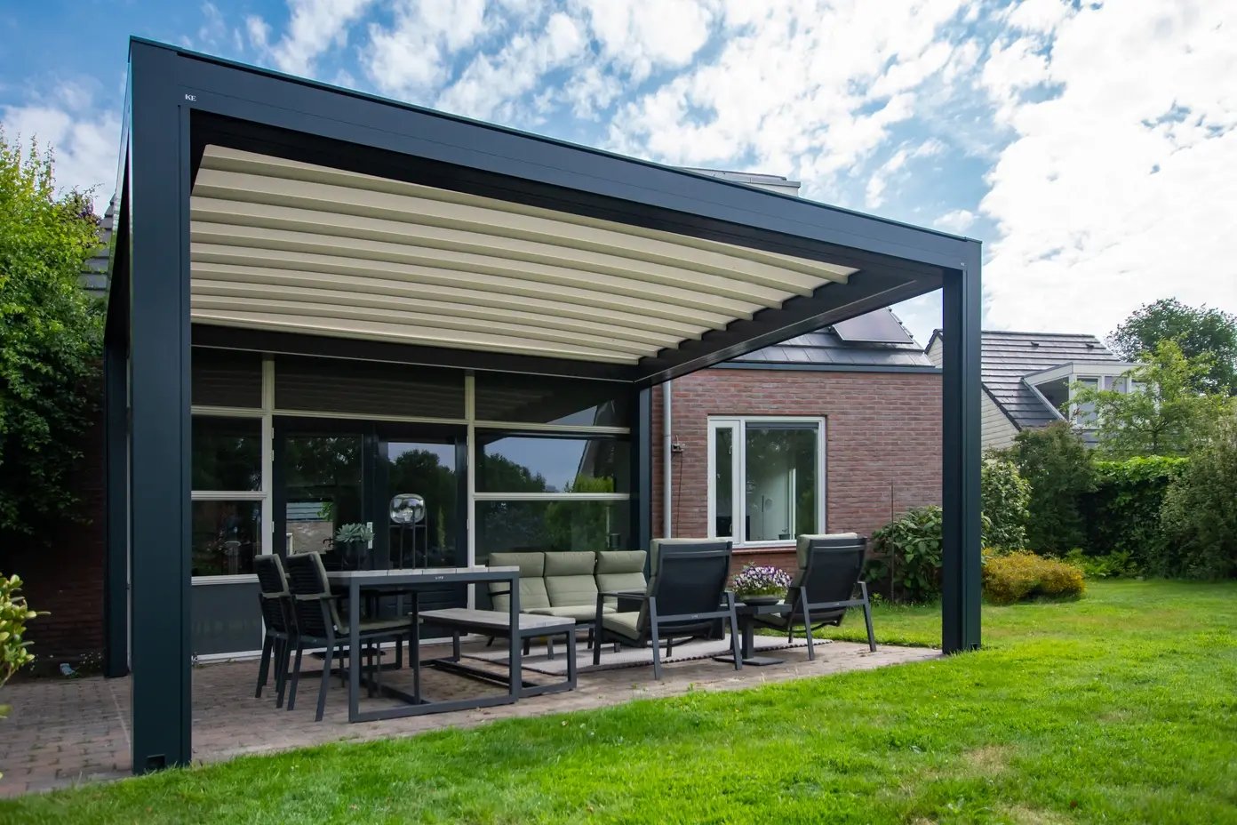 In Epe heeft Artino een terrasoverkapping met uitschuifbaar doek geplaatst. Het doek van de terrasoverkapping geeft verkoeling tijdens warme dagen en is met de elektrische bediening eenvoudig weer opgeborgen.