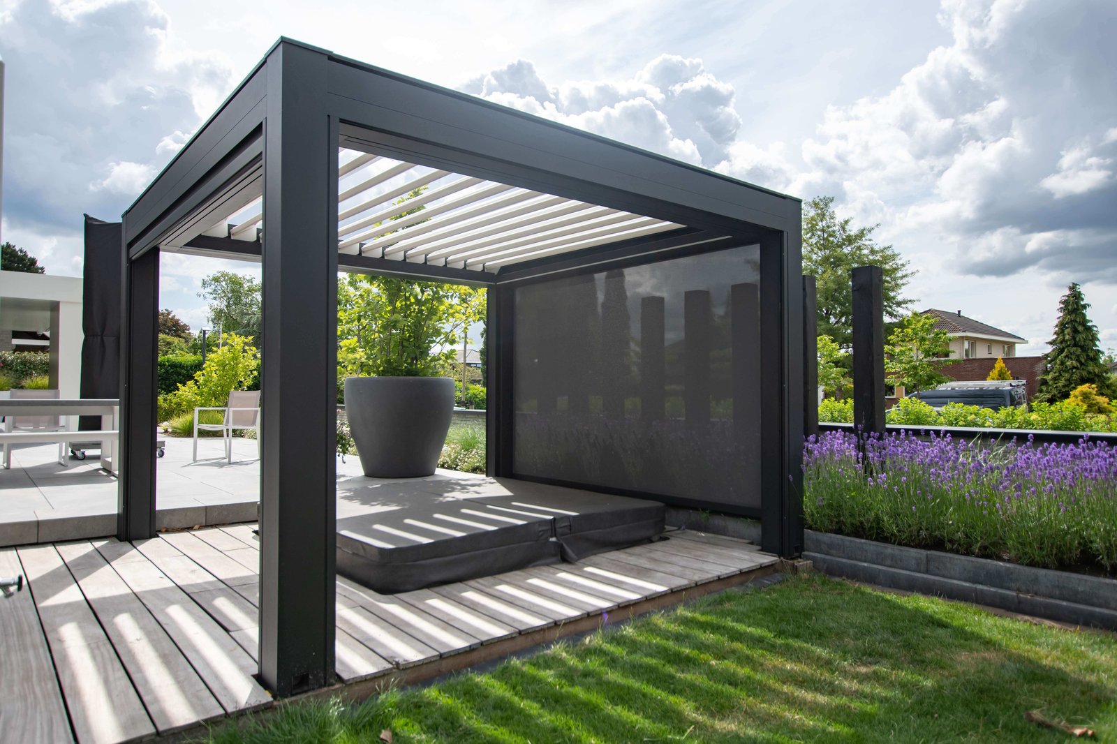 Als aanvulling op de terrasoverkapping met doek zijn er verticale G90 screens geplaatst. Deze strak afgewerkte screens zijn geplaatst om het felle zonlicht tegen te houden. Hierdoor kan de familie op zomerse dagen heerlijk koel onder de terrasoverkapping vertoeven. De screens zijn windvast. Bij wind hoor je weinig tot geen geluid en geklapper door de screens.