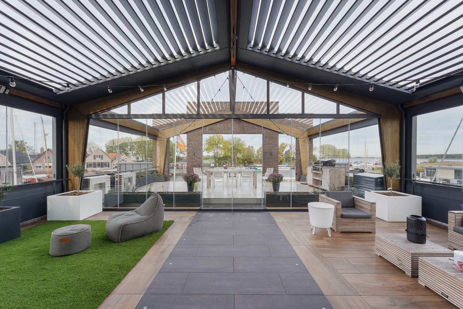 In Bunschoten-Spakenburg realiseerde Artino een prachtige overkapping. Het dak bestaat uit lamellen. Groot voordeel van dit type overkapping is dat de lamellen open kunnen draaien. Als de lamellen zijn gesloten, dan is de overkapping ook nog eens volledig waterdicht. Een ideale oplossing voor een prachtige locatie zoals deze.