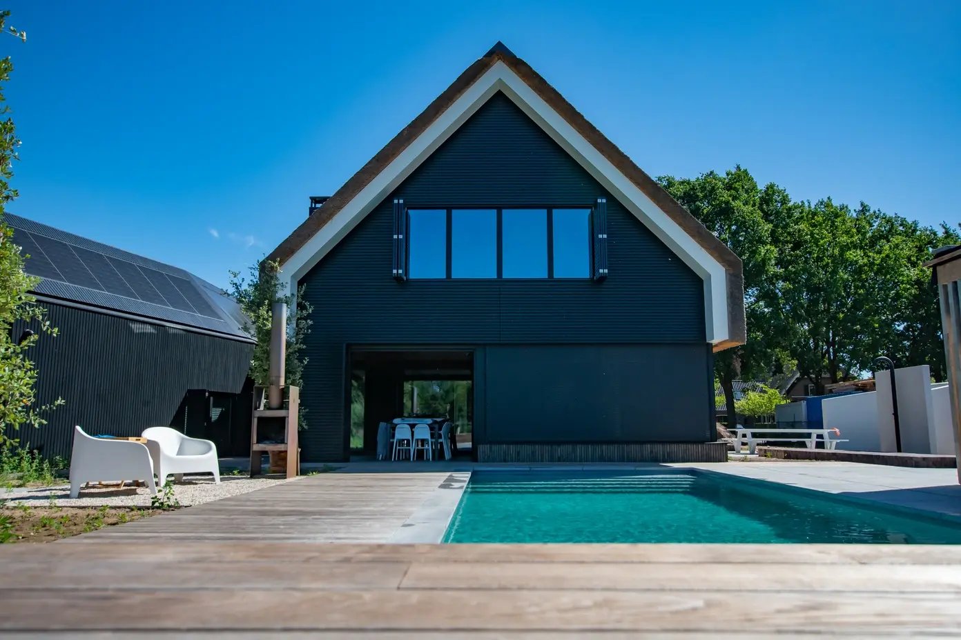 De vouwluiken vallen mooi weg als ze gesloten zijn, ze zijn namelijk een verlengstuk van de gevelbekleding. Dit zorgt ervoor dat de woning een strak uiterlijk heeft.