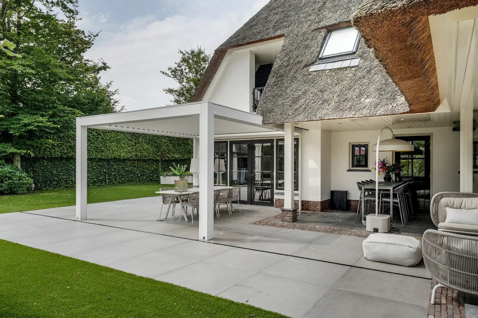 Een overkapping met lamellen geeft je de meeste regie: je stuurt licht en schaduw heel precies en, afhankelijk van het model, kun je het pakket deels openen voor een extra open gevoel. Sluit je de lamellen, dan is het dak waterdicht met een geïntegreerde afvoer en oogt het geheel strak en architectonisch.