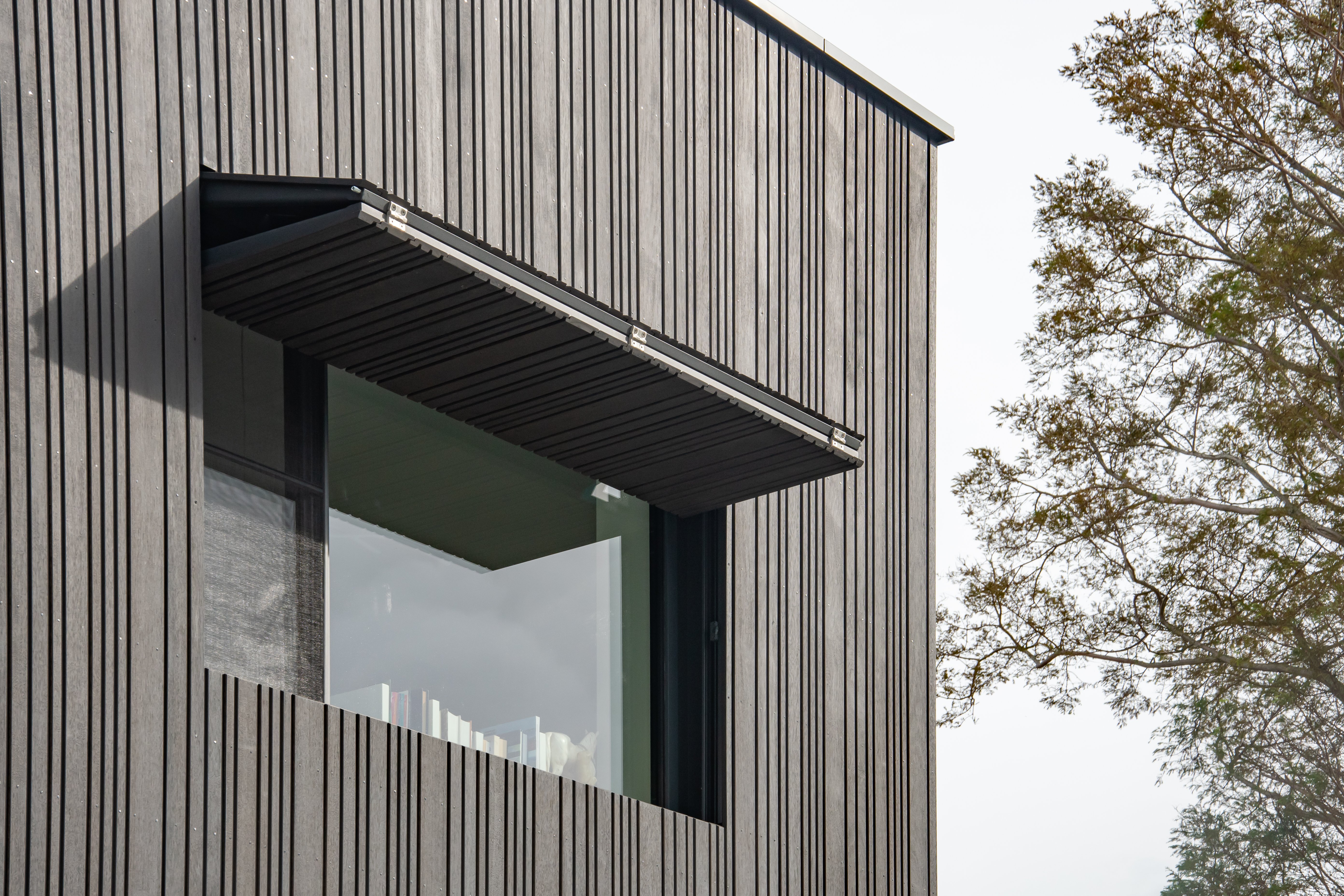 Structurele zonwering met houten bekleding, ook bekend als houten brise soleil, is een elegante oplossing waarmee permanente zonwering gecreëerd kan worden. Dit type zonwering is te monteren als lamellen voor het raam of als luifel. Het past bijvoorbeeld ook perfect in hoge hoeken met schuine ramen.